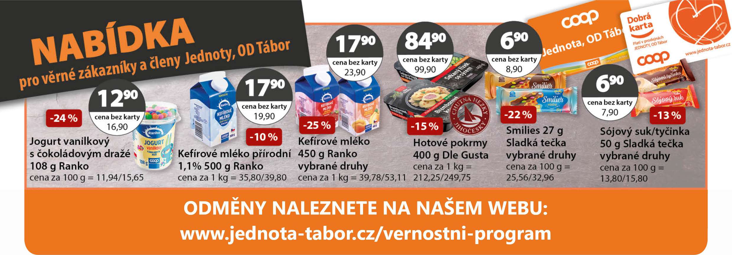 Vybrané druhy výrobků za výhodnější ceny pro držitele zákaznické nebo členské věrnostní karty COOP Jednoty, OD Tábor.