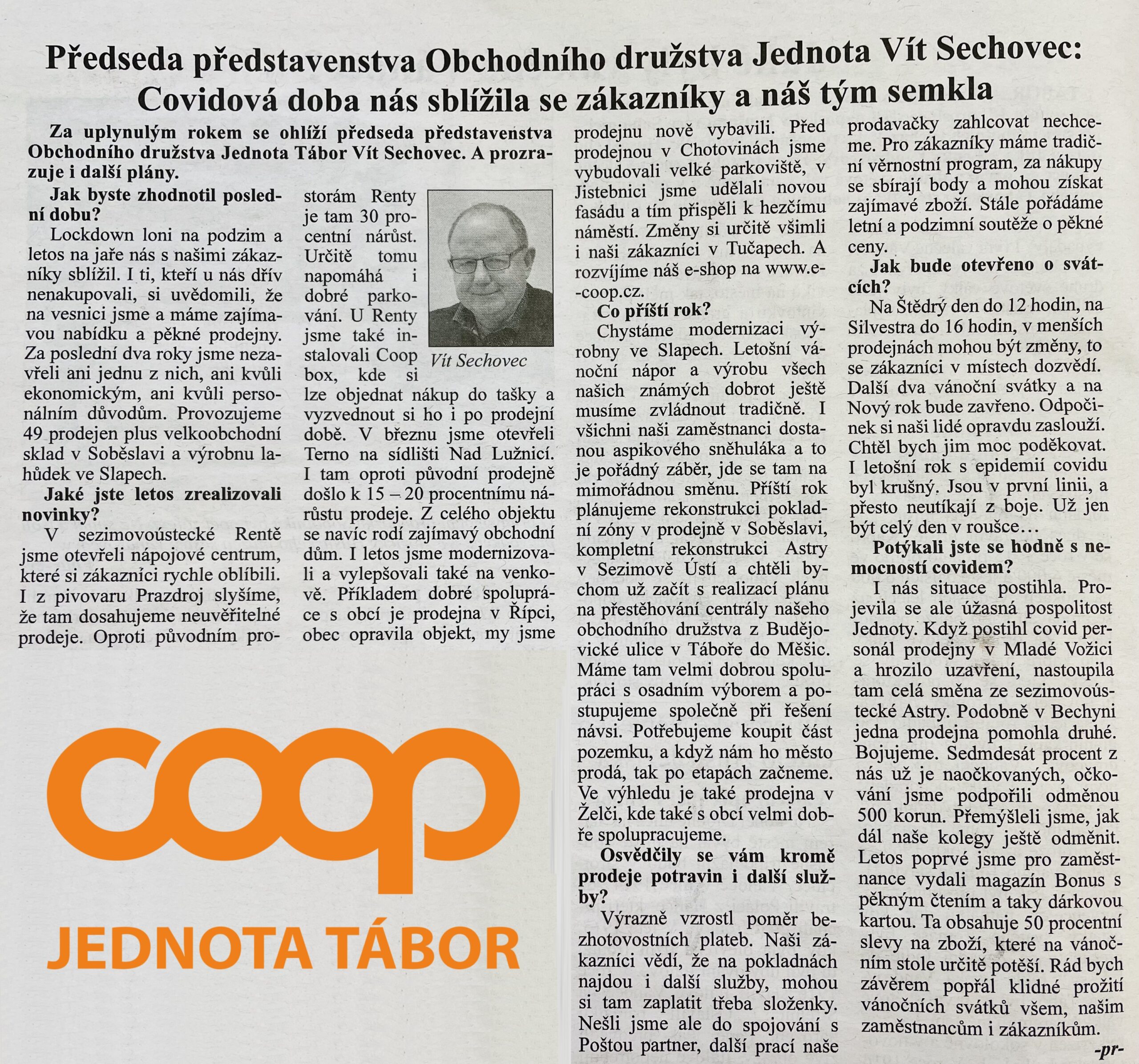 Článek z týdeníku Táborsko ze středy 22. prosince 2021 „Zhodnocení roku a poděkování zaměstnancům“
