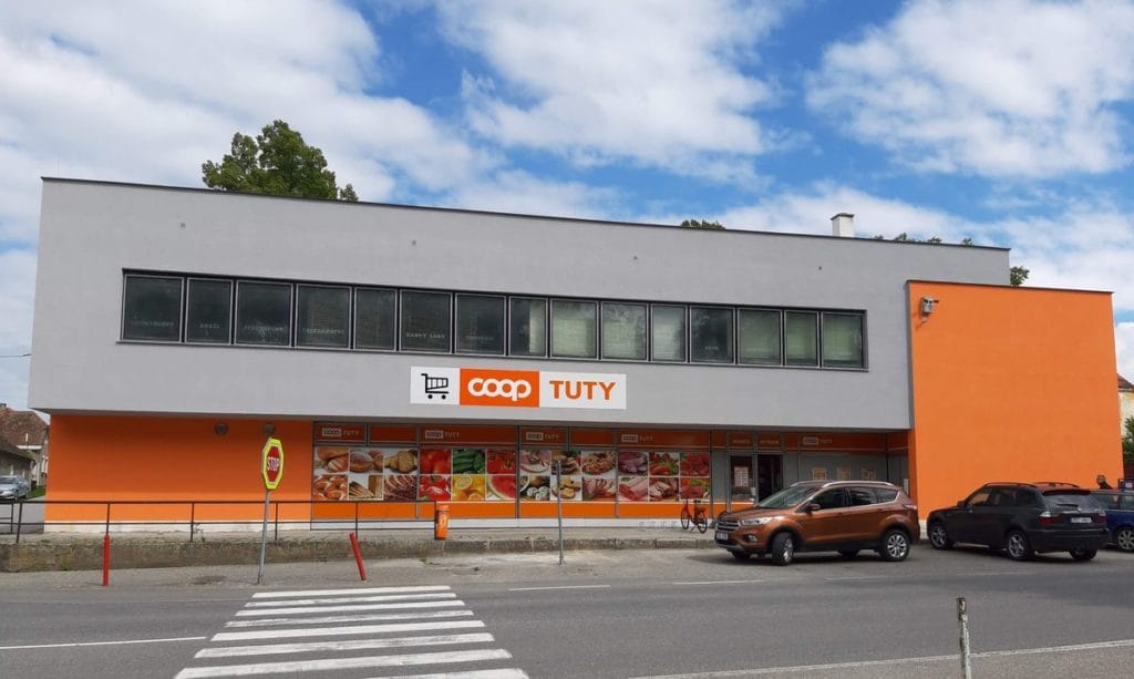 Prodejna COOP Tučapy s novou barevnou fasádou.