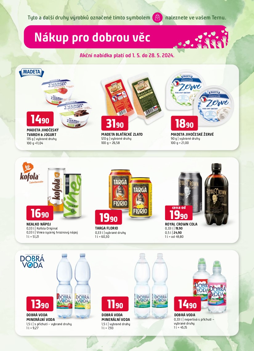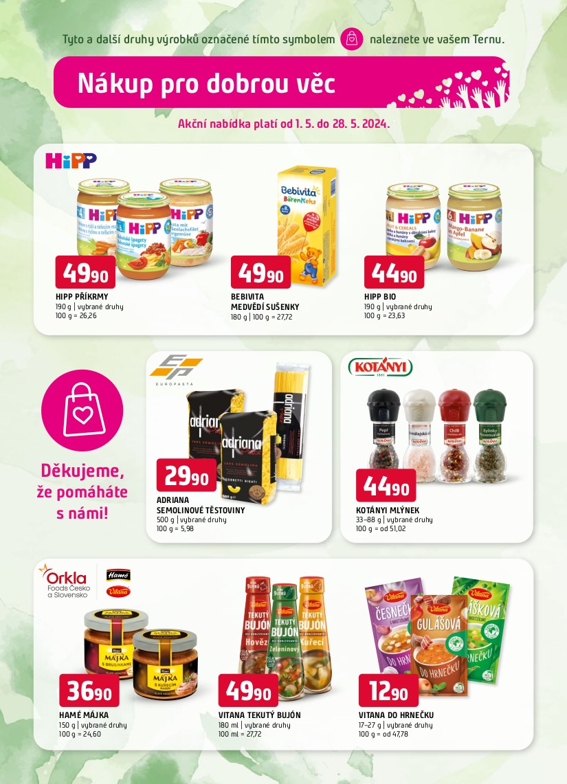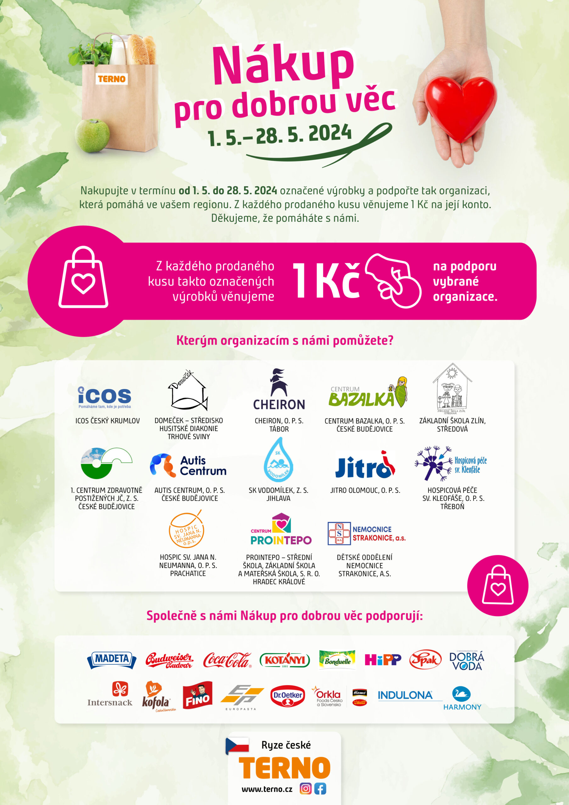 Nakupte od 1. 5. do 28. 5. 2024 vybrané položky v supermarketu COOP TERNO Tábor a my z každého prodaného kusu věnujeme 1 Kč na konto organizace Cheiron Tábor, o.p.s., která pomáhá v našem regionu.