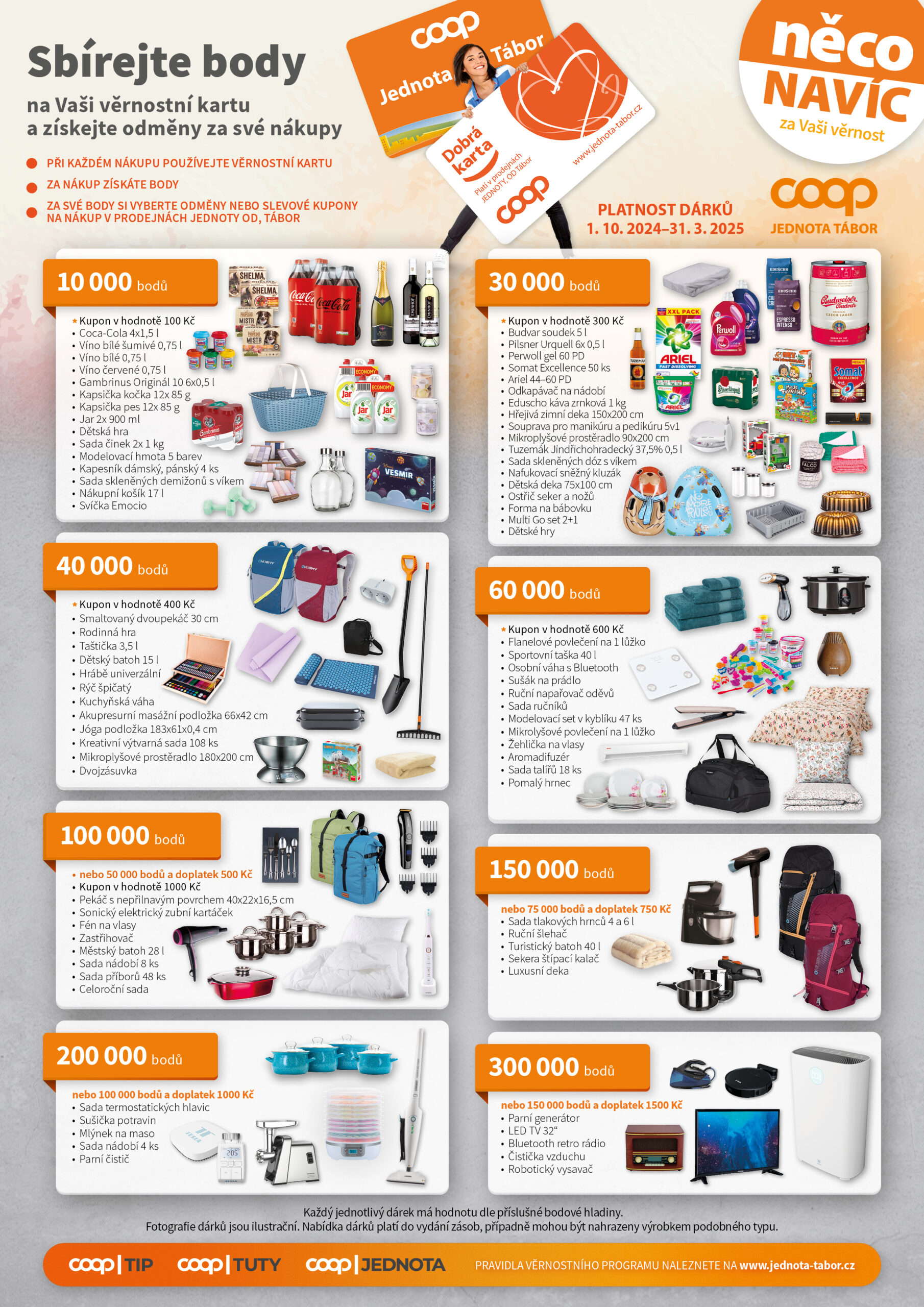 za Vaše body nasbíráné body v rámci věrnostního zákaznického programu COOP Jednoty Tábor si nyní můžete vybírat odměny z nových dárků od 1. 10. 2024 do 31. 3. 2025, nebo do vydání zásob dárků.