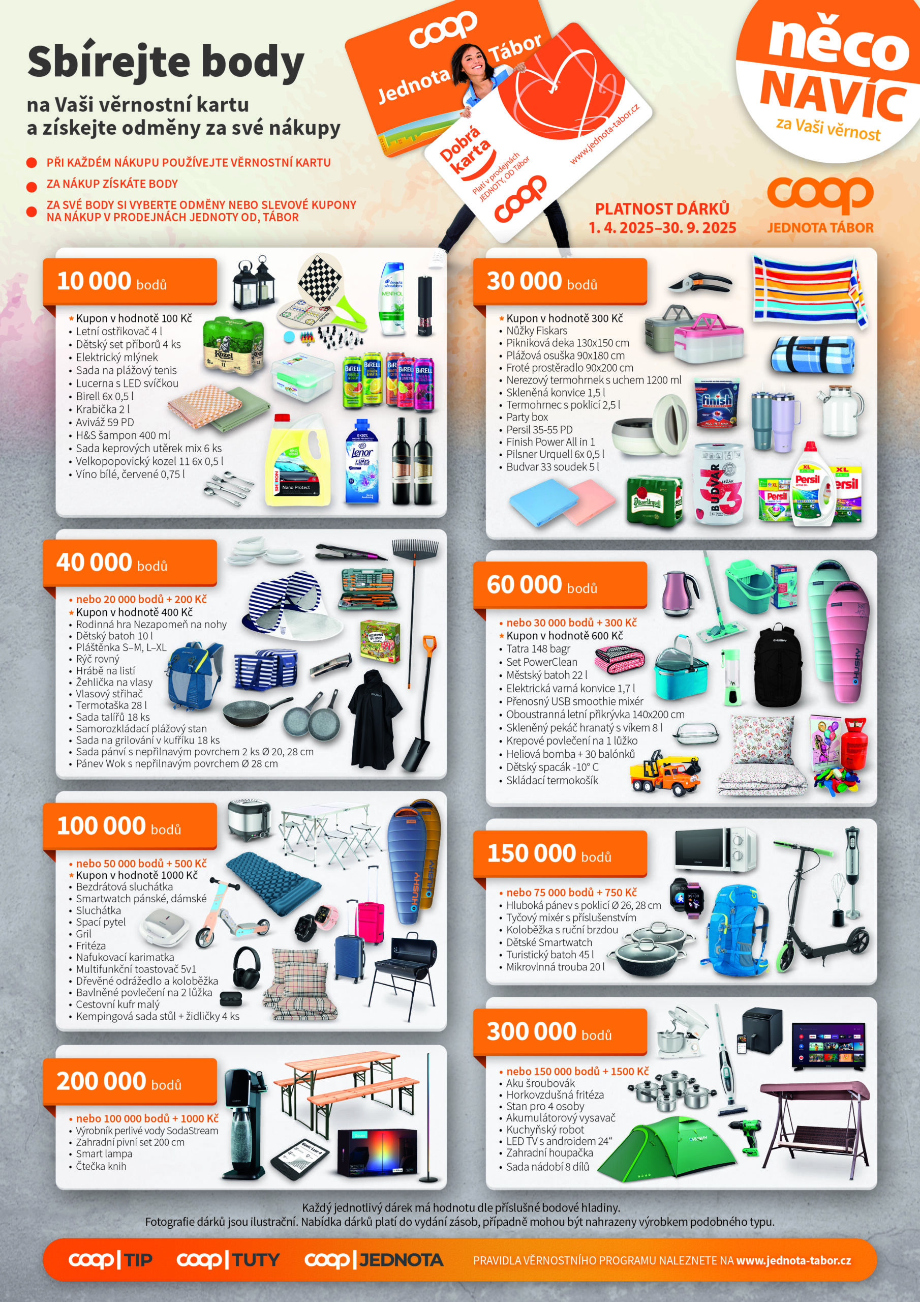 za Vaše body nasbíráné body v rámci věrnostního zákaznického programu COOP Jednoty Tábor si nyní můžete vybírat odměny z nových dárků od 1. 4. 2025 do 30. 9. 2025, nebo do vydání zásob dárků.