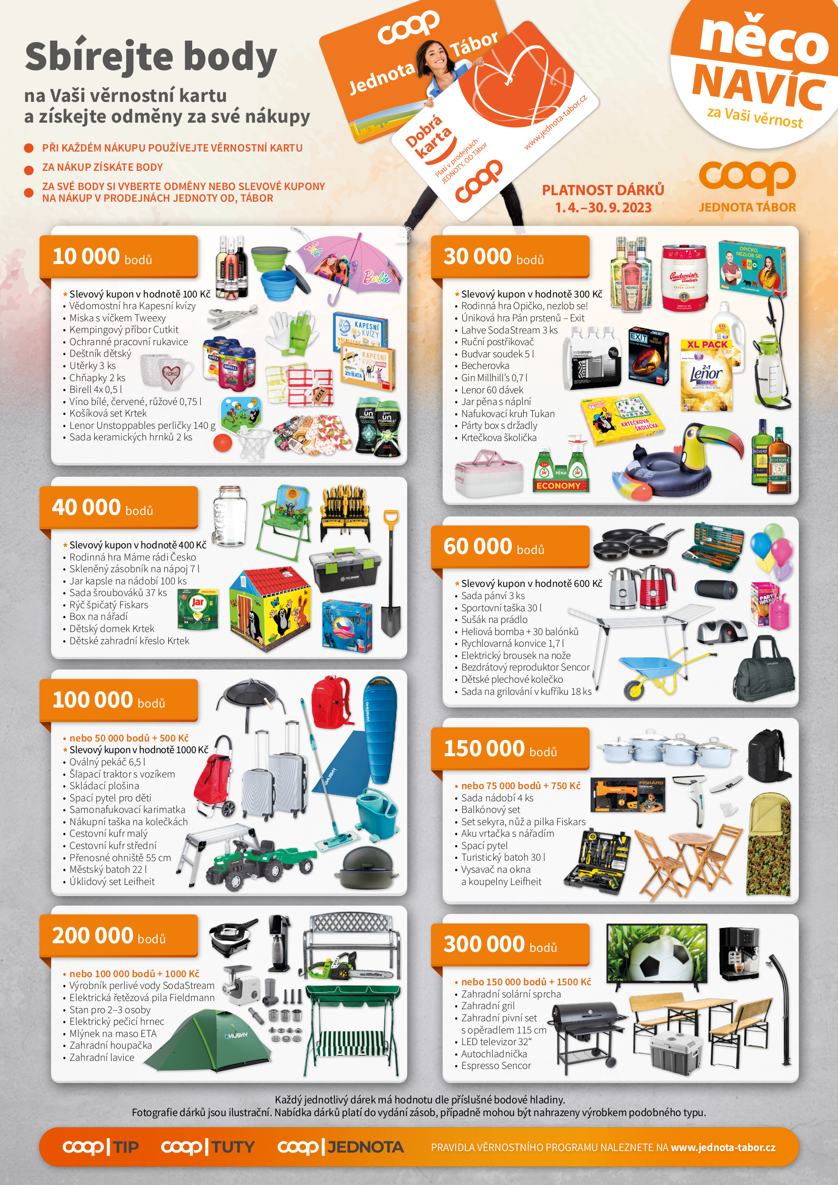 za Vaše body nasbíráné body v rámci věrnostního zákaznického programu COOP Jednoty Tábor si nyní můžete vybírat odměny z nových dárků od 1. 4. do 30. 9. 2023, nebo do vydání zásob dárků.