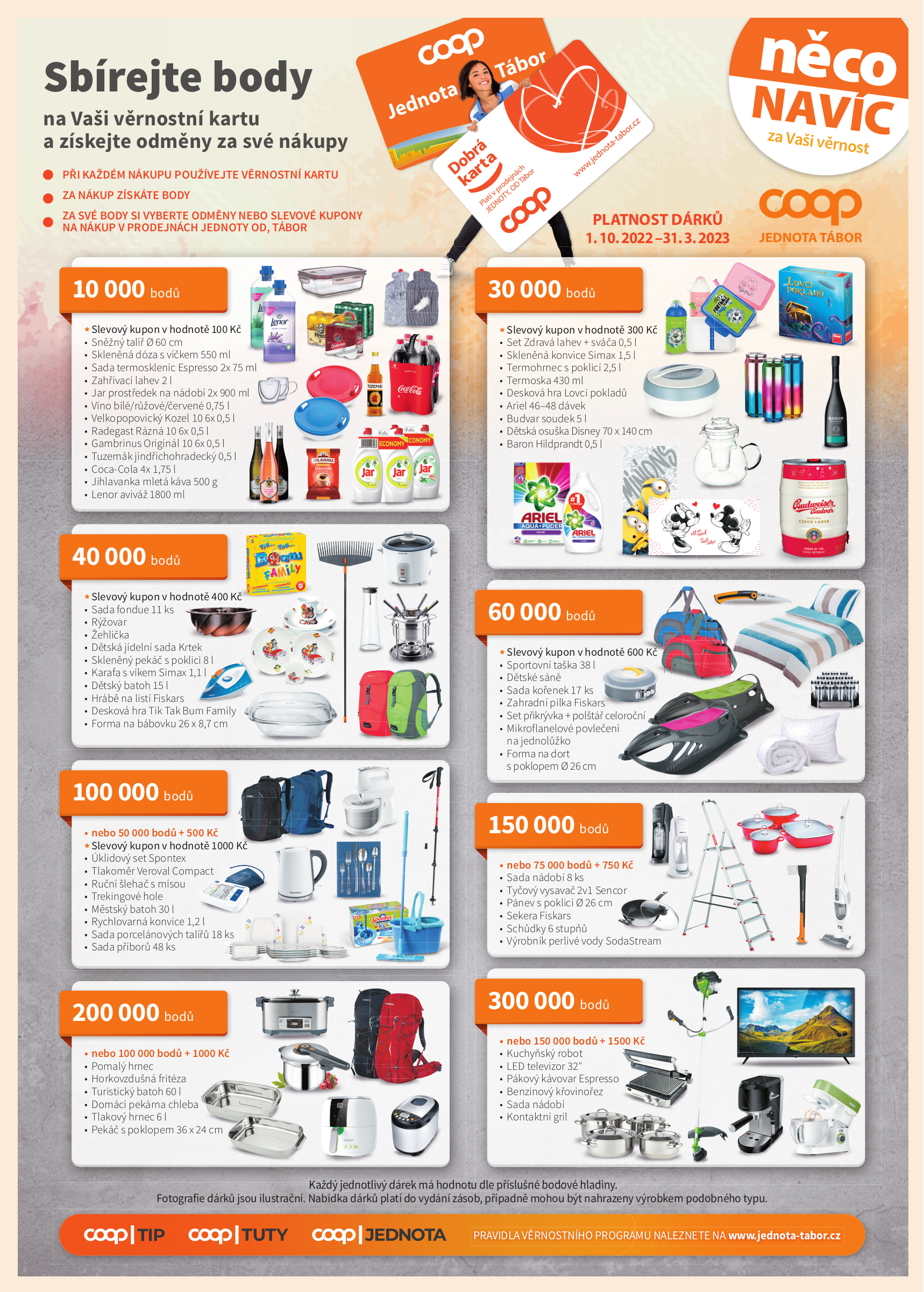 za Vaše body nasbíráné body v rámci věrnostního zákaznického programu COOP Jednoty Tábor si nyní můžete vybírat odměny z nových dárků od 1. 10. 2022 do 31. 3. 2023, nebo do vydání zásob dárků.