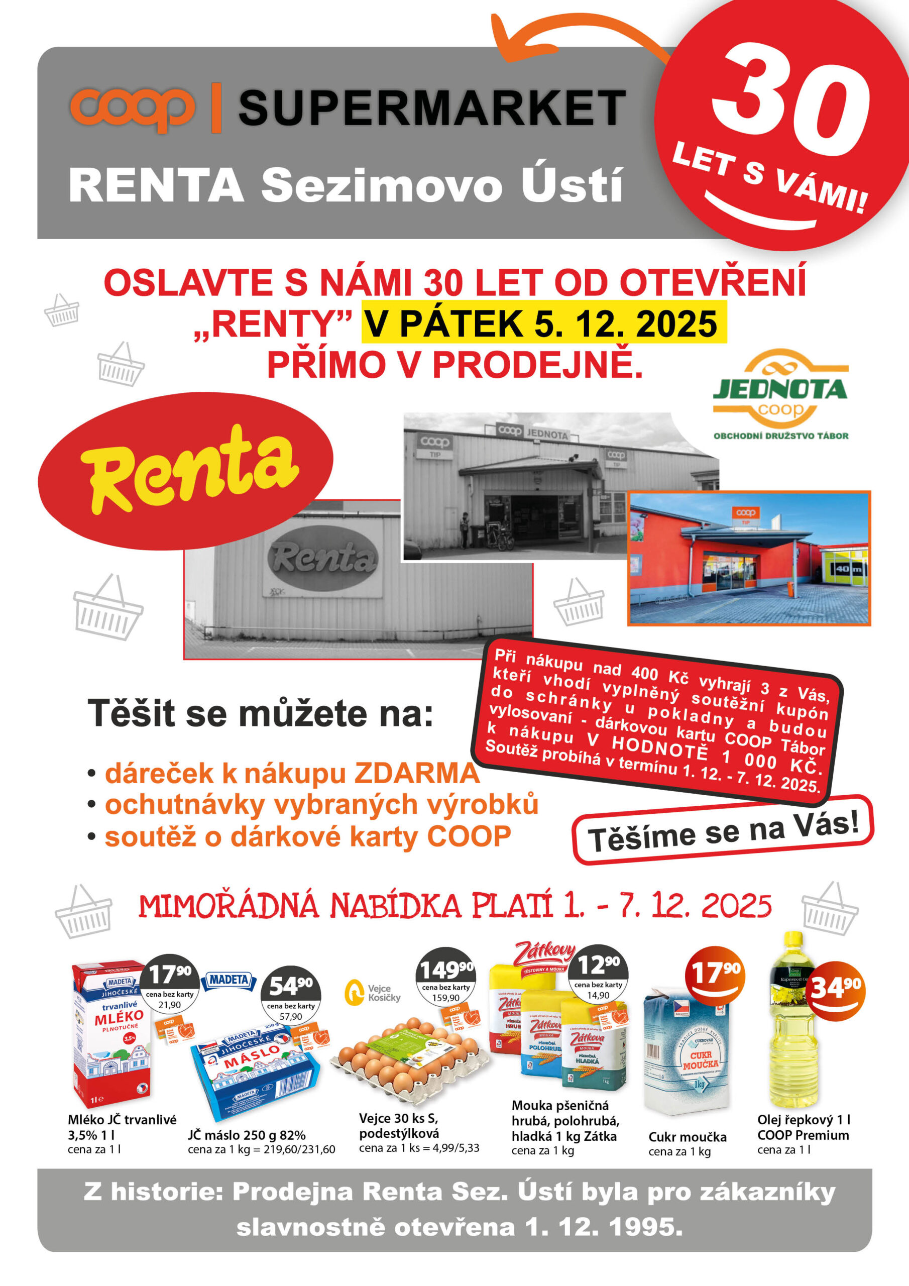 OSLAVTE S NÁMI 30 LET PRODEJNY RENTY V SEZIMOVĚ ÚSTÍ V PÁTEK 5. 12. 2025