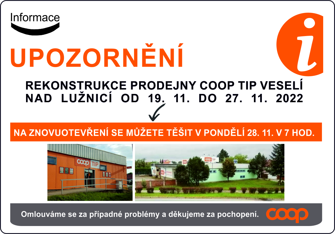 od 19. 11. do 27. 11. 2022 probíhá REKONSTRUKCE supermarketu COOP TIP Veselí nad Lužnicí, během které bude prodejna ZAVŘENÁ.