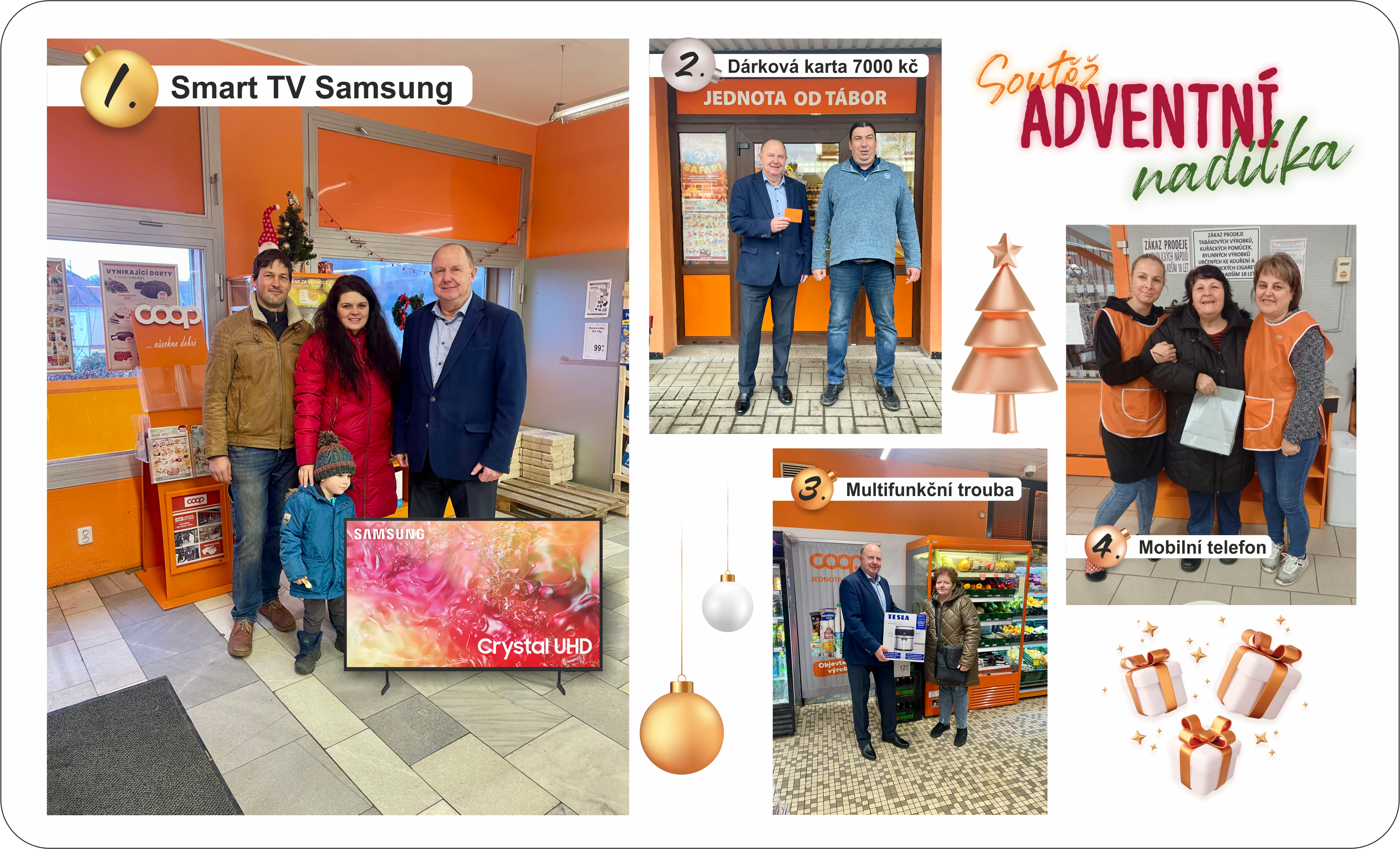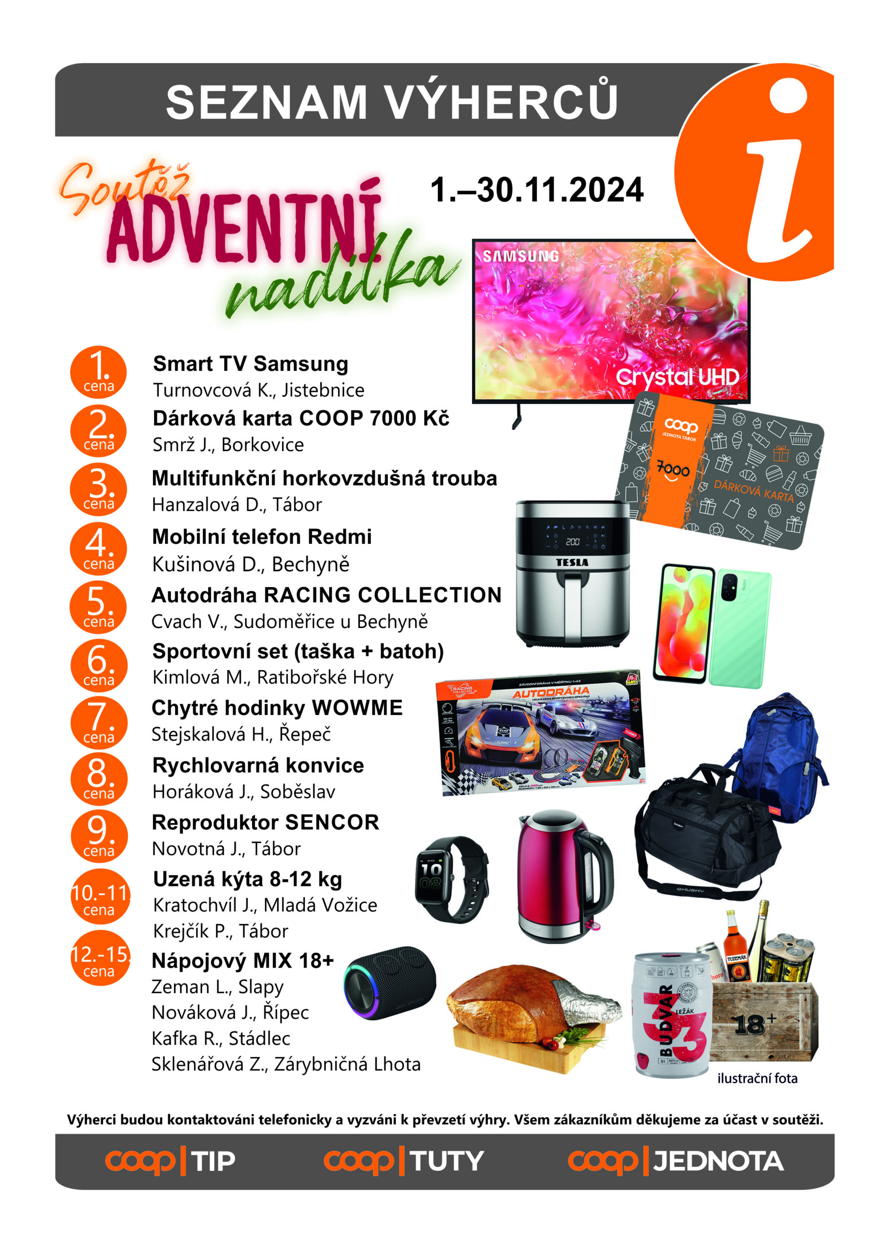 Soutěž „ADVENTNÍ NADÍLKA“ probíhající od 1. 11 do 30. 11. 2024 v prodejnách COOP TIP, TUTY a JEDNOTA pořádaná pro zákazníky COOP TÁBOR zná své výherce. Ze všech soutěžících ze všech prodejen bylo vylosováno 15 výherců a v těchto dnech jsou kontaktováni a jejich výhry jsou jim předávány na jednotlivých prodejnách.