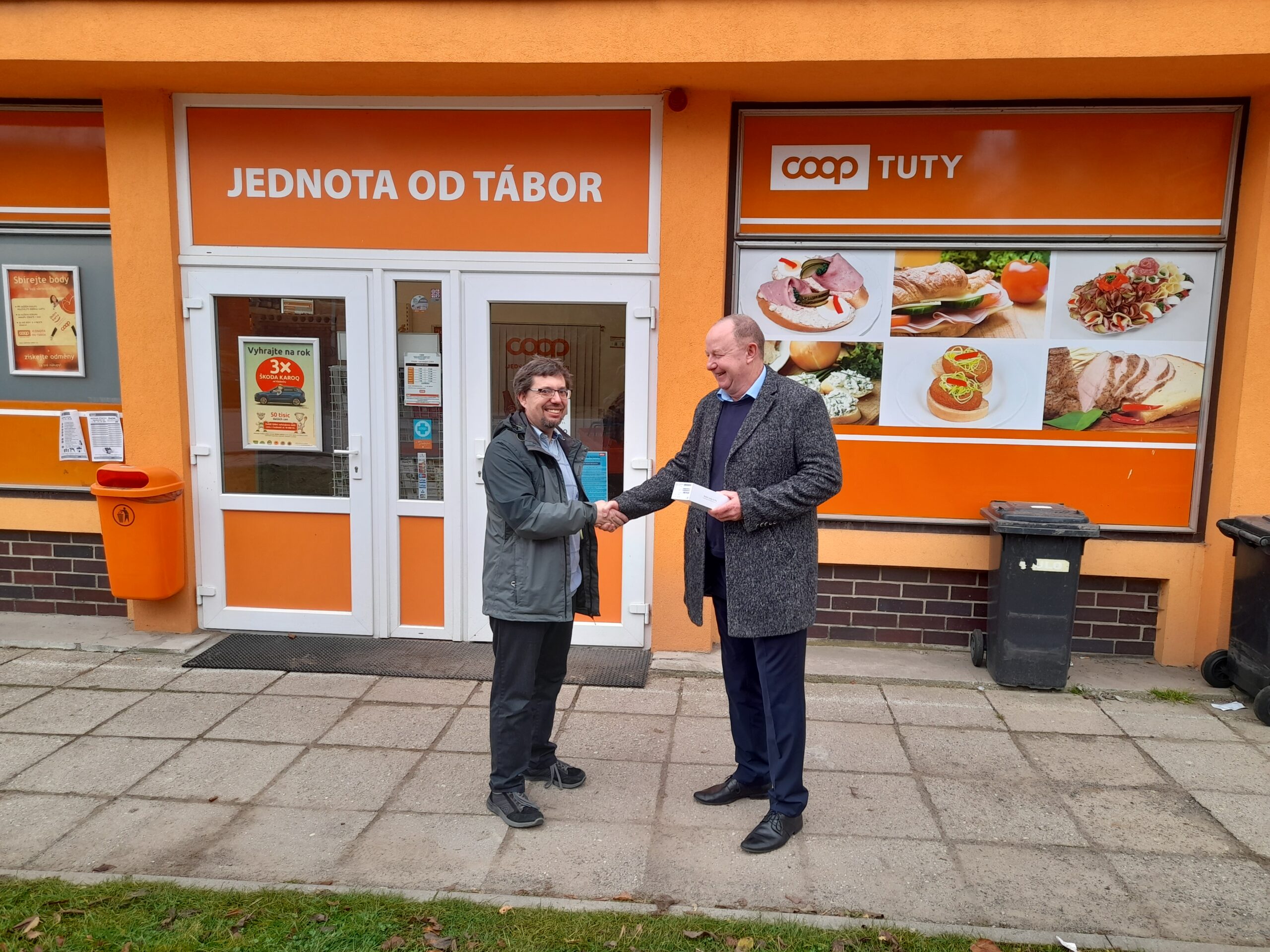 Předávání 3. ceny – Mobilní telefon – výherce pan Houda s panem předsedou Ing. Vítem Sechovcem před prodejnou COOP TUTY Rat. Hory
