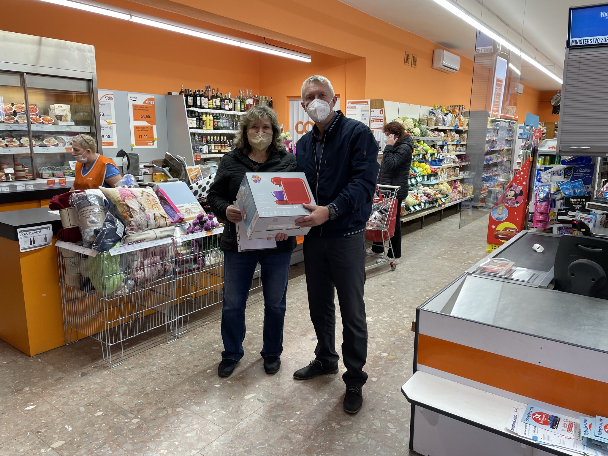 Předávání 4. ceny – Kávovar Tassimo Bosch Vivi 2 – výherkyně paní Skálová s vedoucím obch. – provoz. odd. panem Primusem v prodejně COOP TUTY Košice