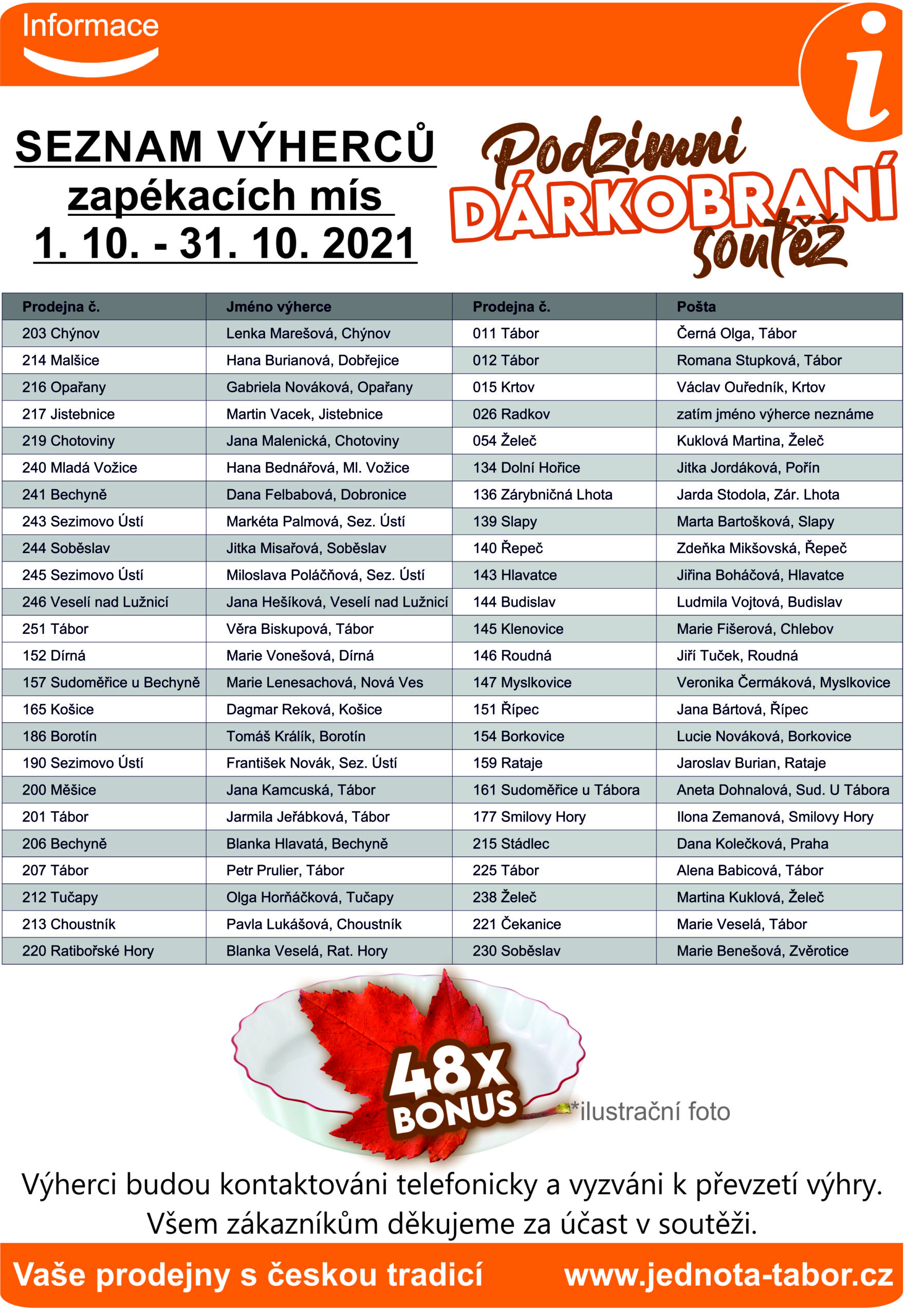 Soutěž „dárkobraní“ pro naše zákazníky probíhající od 1. 10. do 31. 10. 2021 už zná své výherce. Ze všech soutěžících ze všech prodejen bylo vylosováno 11 výherců, kteří byli kontaktováni a v následujích dnech jim budou předávány výhry a dalších 48 výherců z každé prodejny – 1 prodejna = 1 výherce = 1 zapékací mísa, všechny výhry budou předávány na jednotlivých prodejnách.