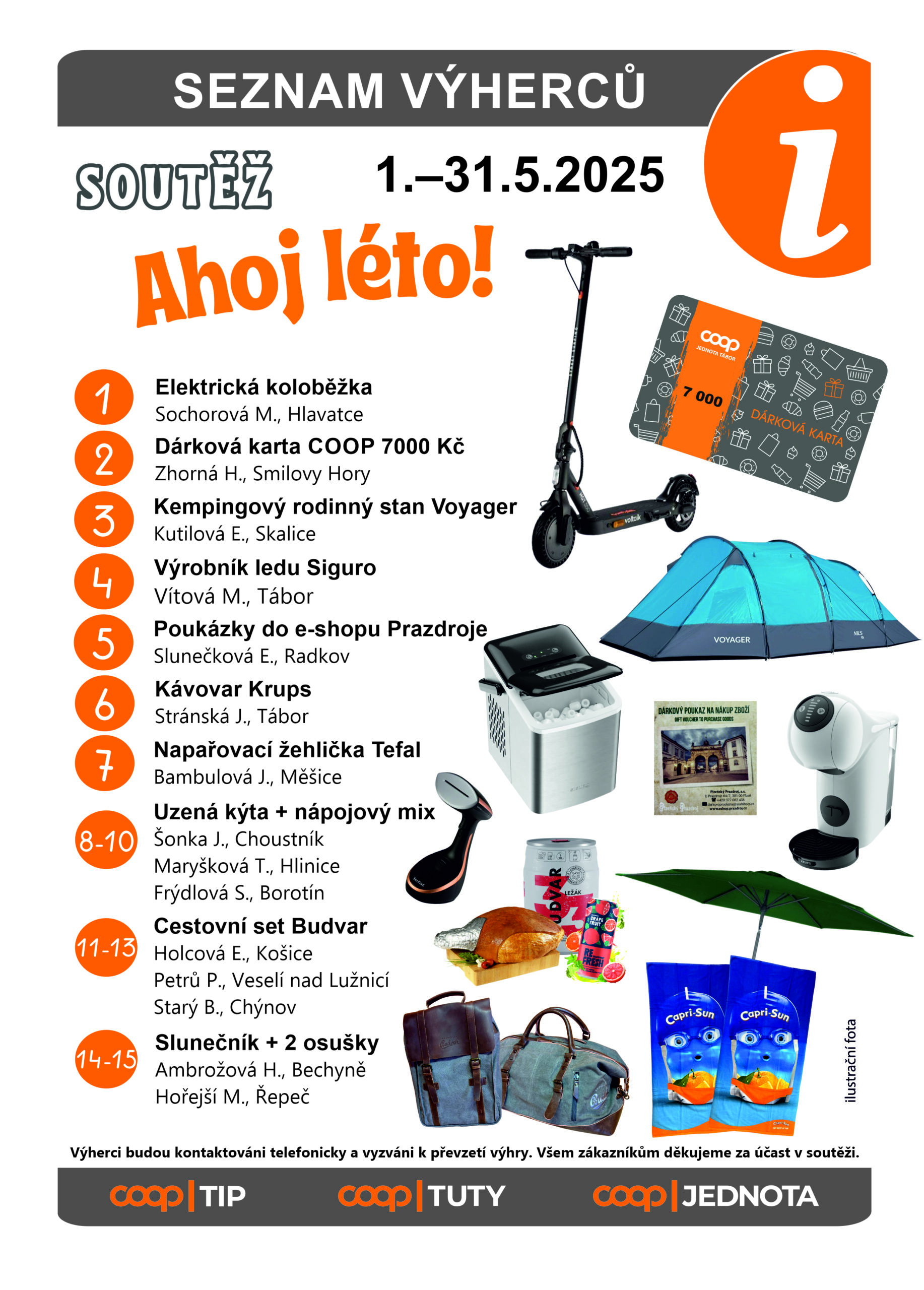 Soutěž „AHOJ LÉTO!“ probíhající od 1. 5 do 31. 5. 2025 v prodejnách COOP TIP, TUTY a JEDNOTA pořádaná pro zákazníky COOP TÁBOR zná své výherce. Ze všech soutěžících ze všech prodejen bylo vylosováno 15 výherců a v těchto dnech jsou jim jejich výhry předávány na jednotlivých prodejnách.