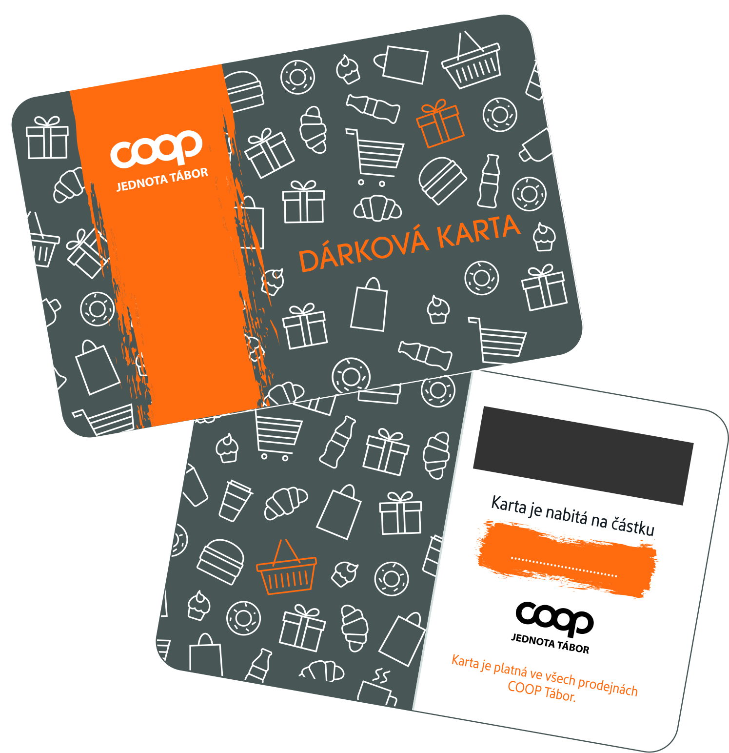 V našich prodejnách si můžete zakoupit dárkové karty, které si můžete nechat nabít na jakoukoliv částku (min. 300 Kč, max. neomezena). S kartou lze platit jako s běžnou platební kartou v celé obchodní síti prodejen COOP JEDNOTY TÁBOR, je přenosná, platná 1 rok od nabití a lze s ní platit opakovaně, až do úplného vyčerpání přednabité částky.