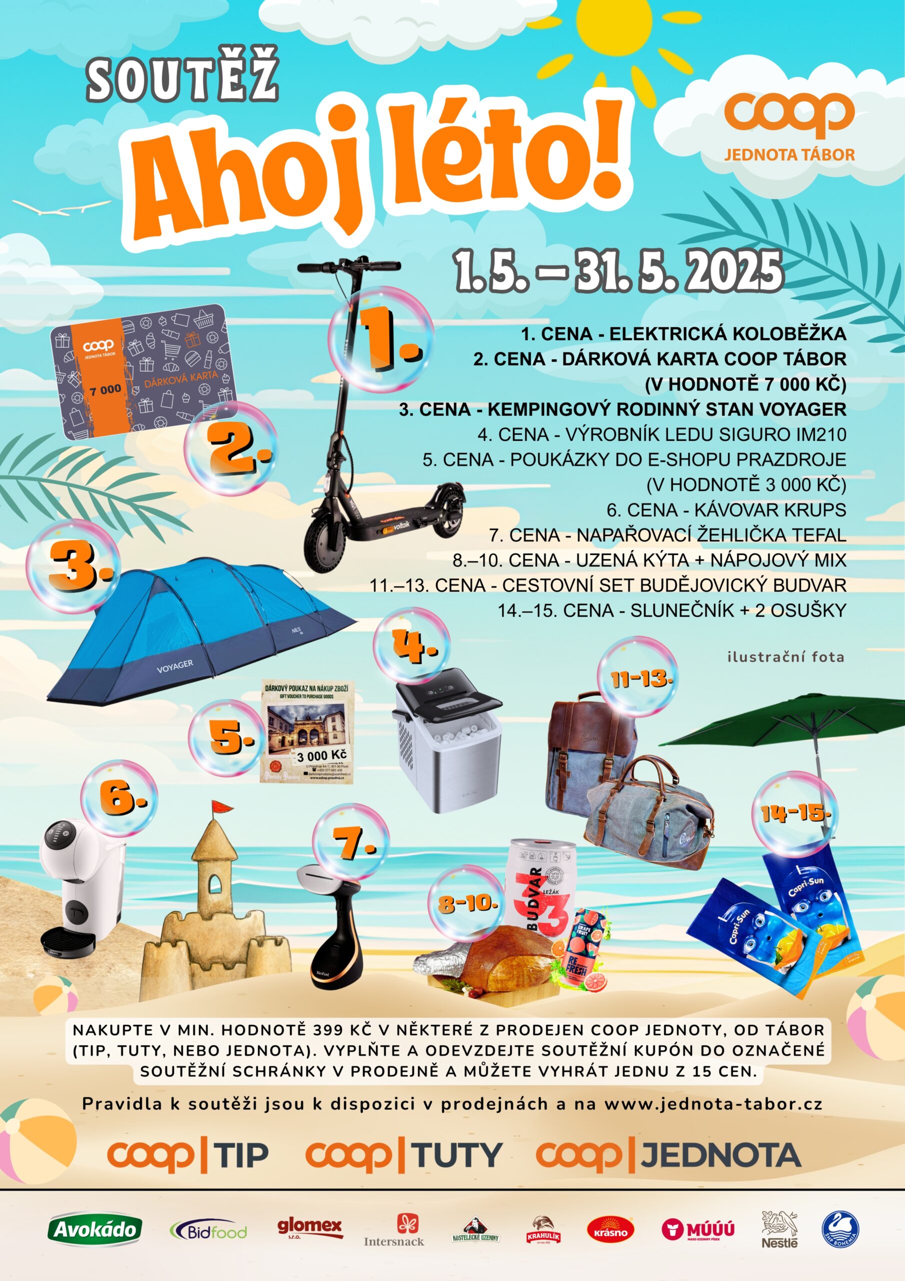 Zákaznická soutěž „AHOJ LÉTO“ probíhající od 1. 5. do 31. 5. 2025 v prodejnách COOP Jednoty Tábor (TIP, TUTY A JEDNOTA) o 15 krásných cen.
