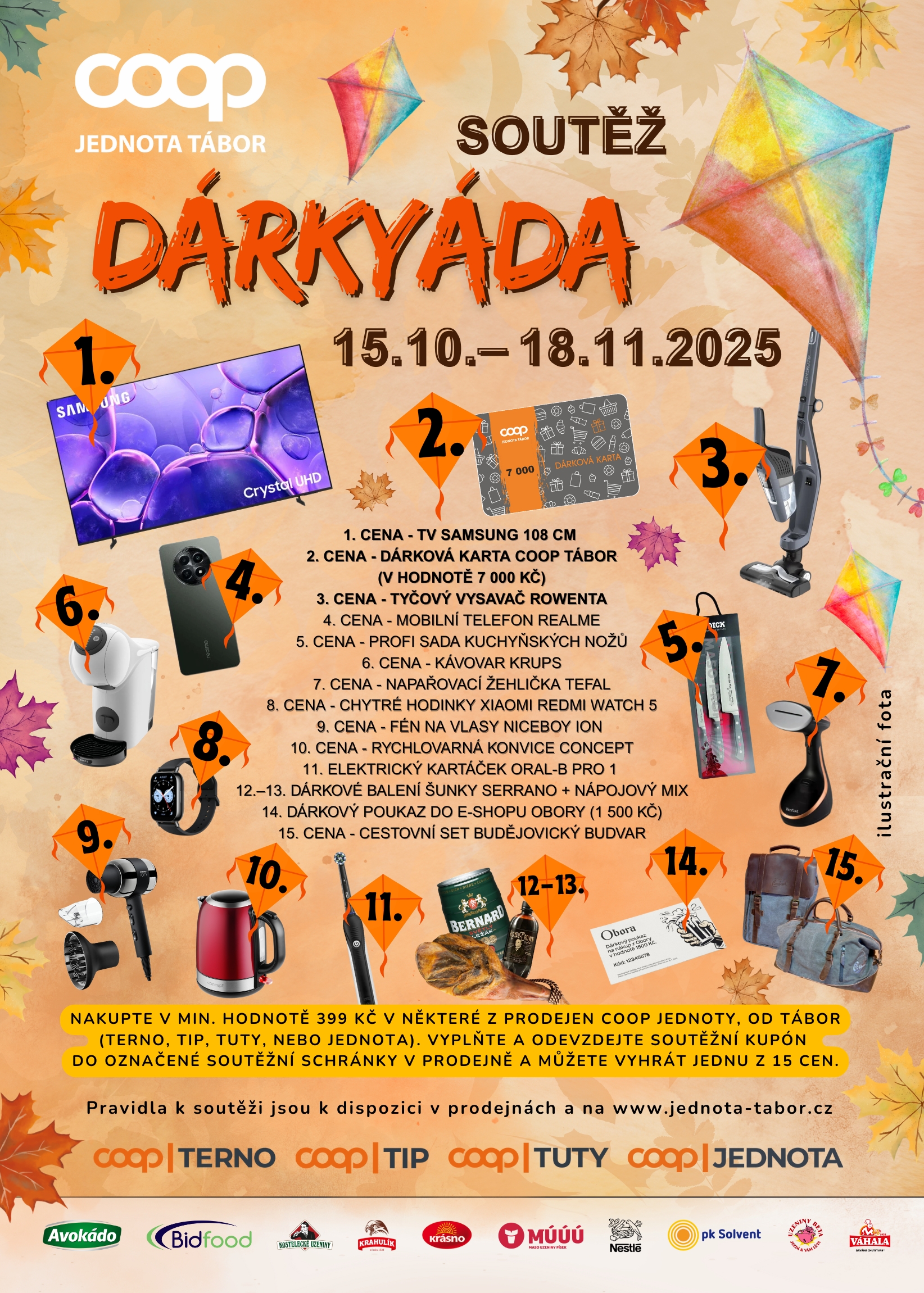 Zákaznická soutěž „DÁRKYÁDA“ probíhající od 15. 10. do 18. 11. 2025 v prodejnách COOP Jednoty Tábor (TERNO, TIP, TUTY A JEDNOTA) o 15 krásných cen.