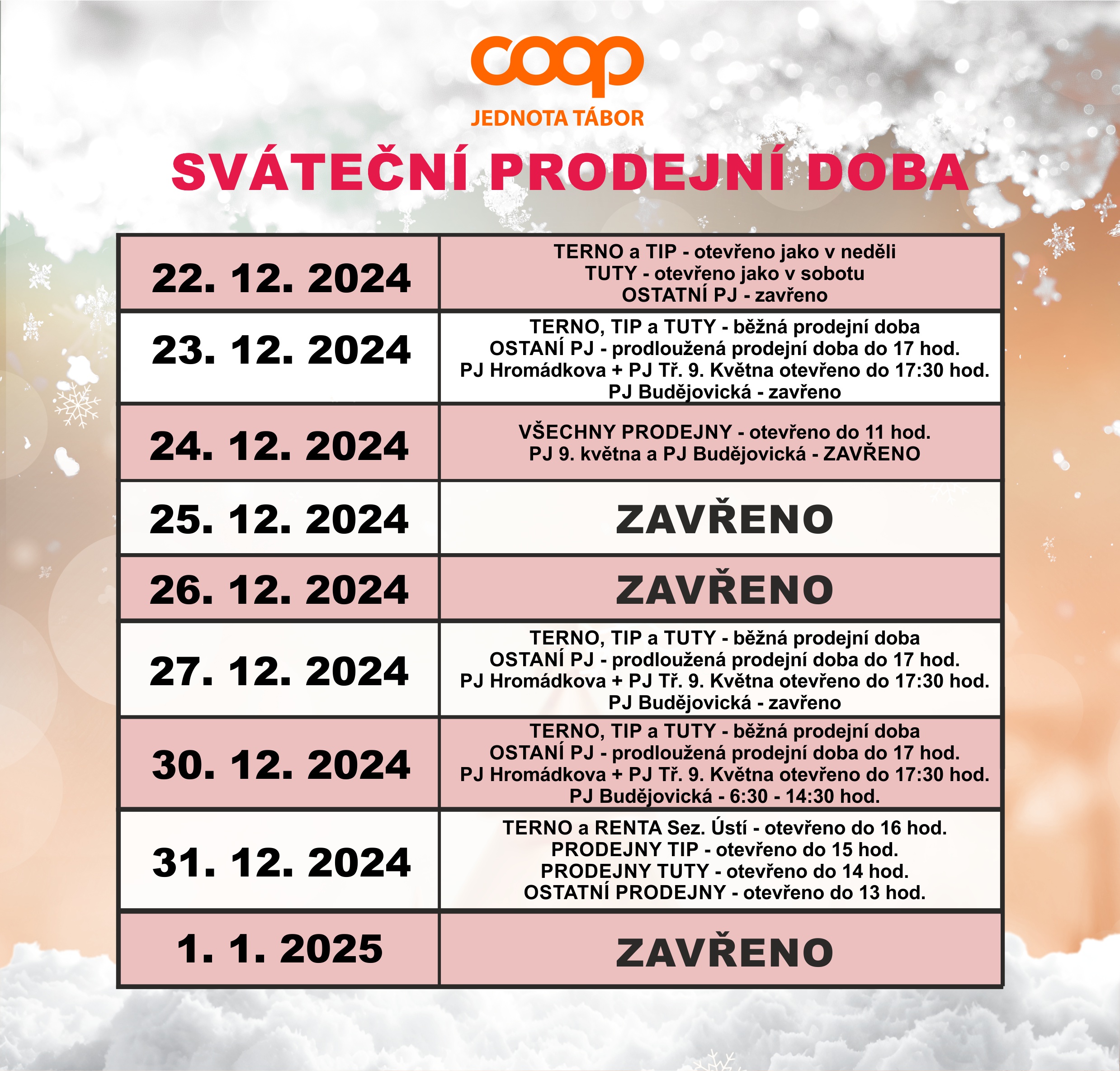 letošní sváteční prodejní doba našich prodejen COOP TERNO, TIP, TUTY a JEDNOTA viz tabulka níže: