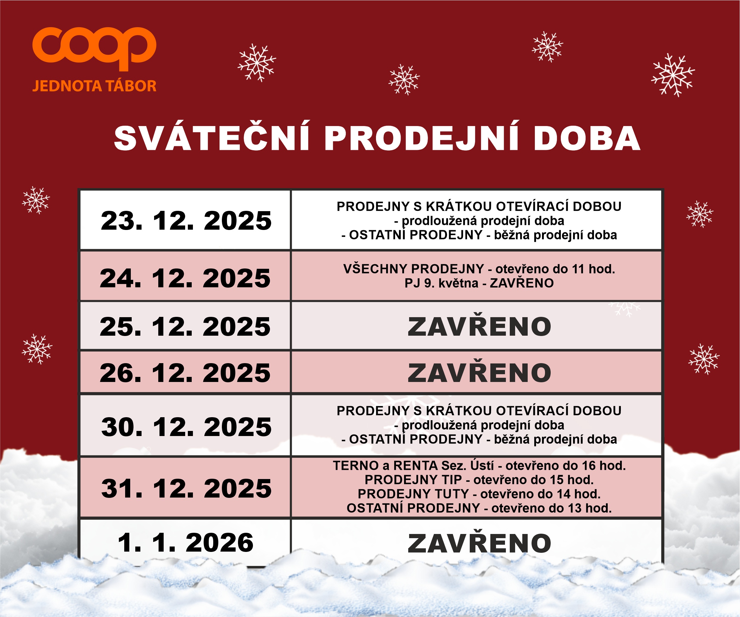 letošní sváteční prodejní doba našich prodejen COOP TERNO, TIP, TUTY a JEDNOTA viz tabulka níže: