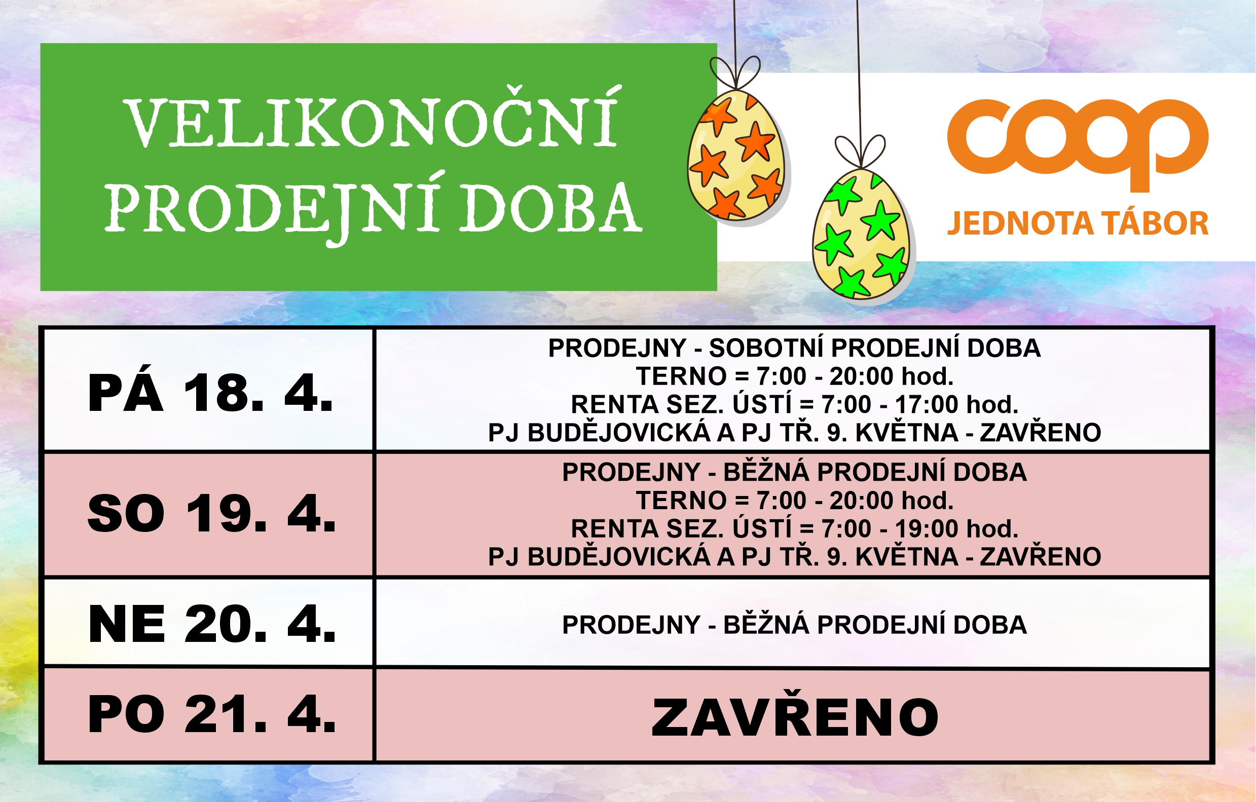 velikonoční prodejní doba našich prodejen COOP TERNO, TIP, TUTY a JEDNOTA viz tabulka níže:
