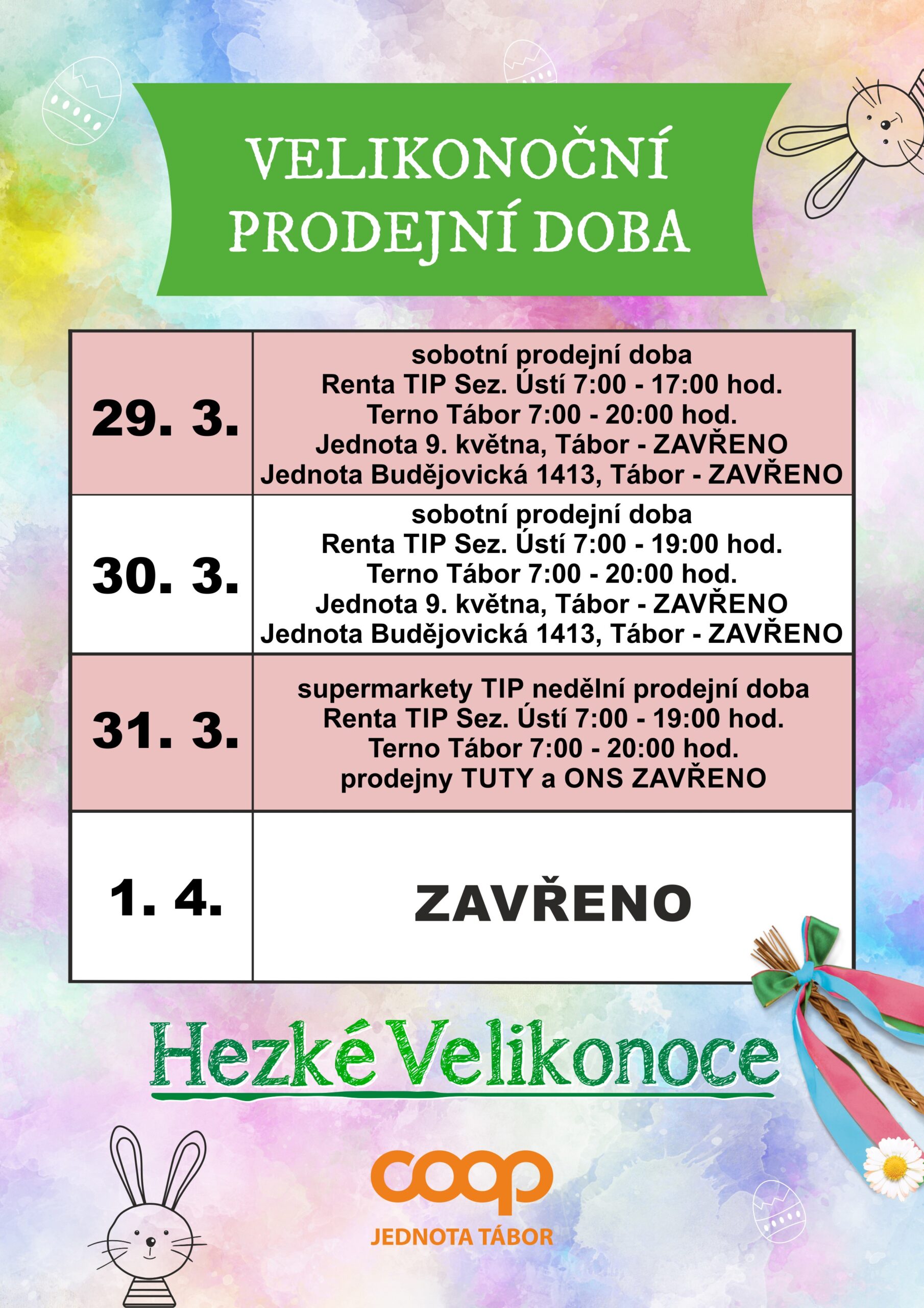 velikonoční prodejní doba našich prodejen COOP TERNO, TIP, TUTY a JEDNOTA viz tabulka níže: