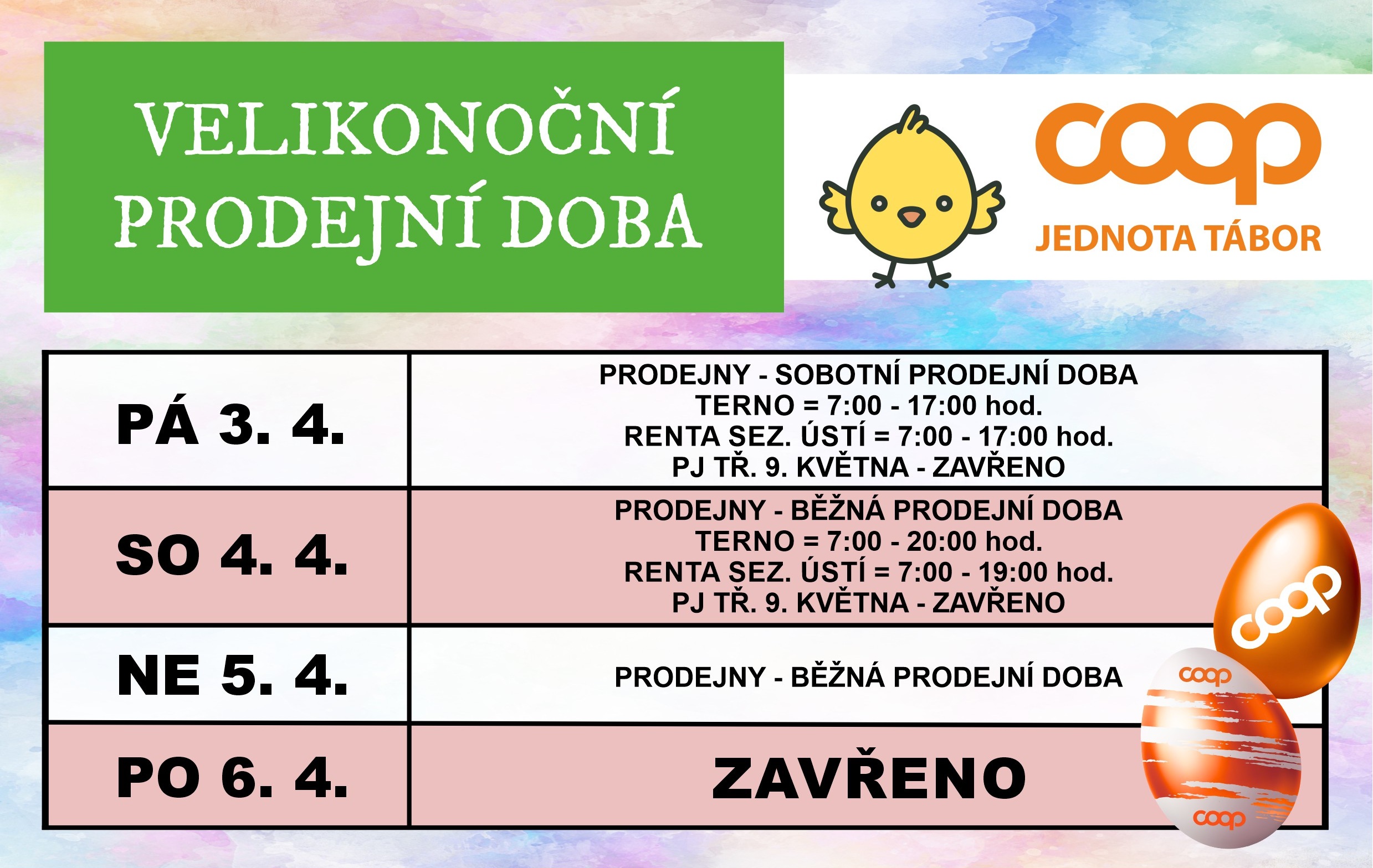 velikonoční prodejní doba našich prodejen COOP TERNO, TIP, TUTY a JEDNOTA viz tabulka níže:
