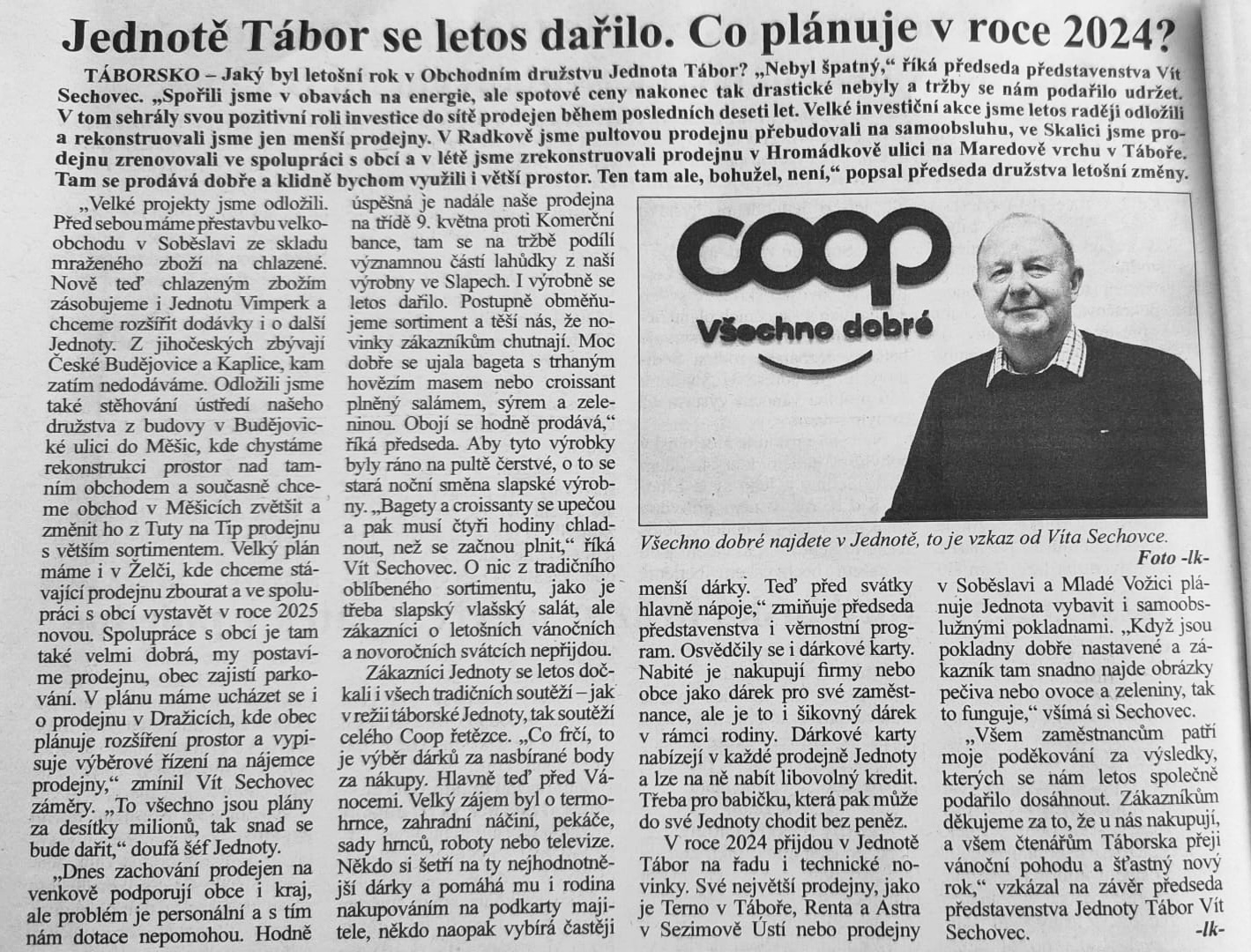 Článek z týdeníku Táborsko č. 50/2023 ze středy 20. prosince 2023 „Všechno dobré najdete v Jednotě“.