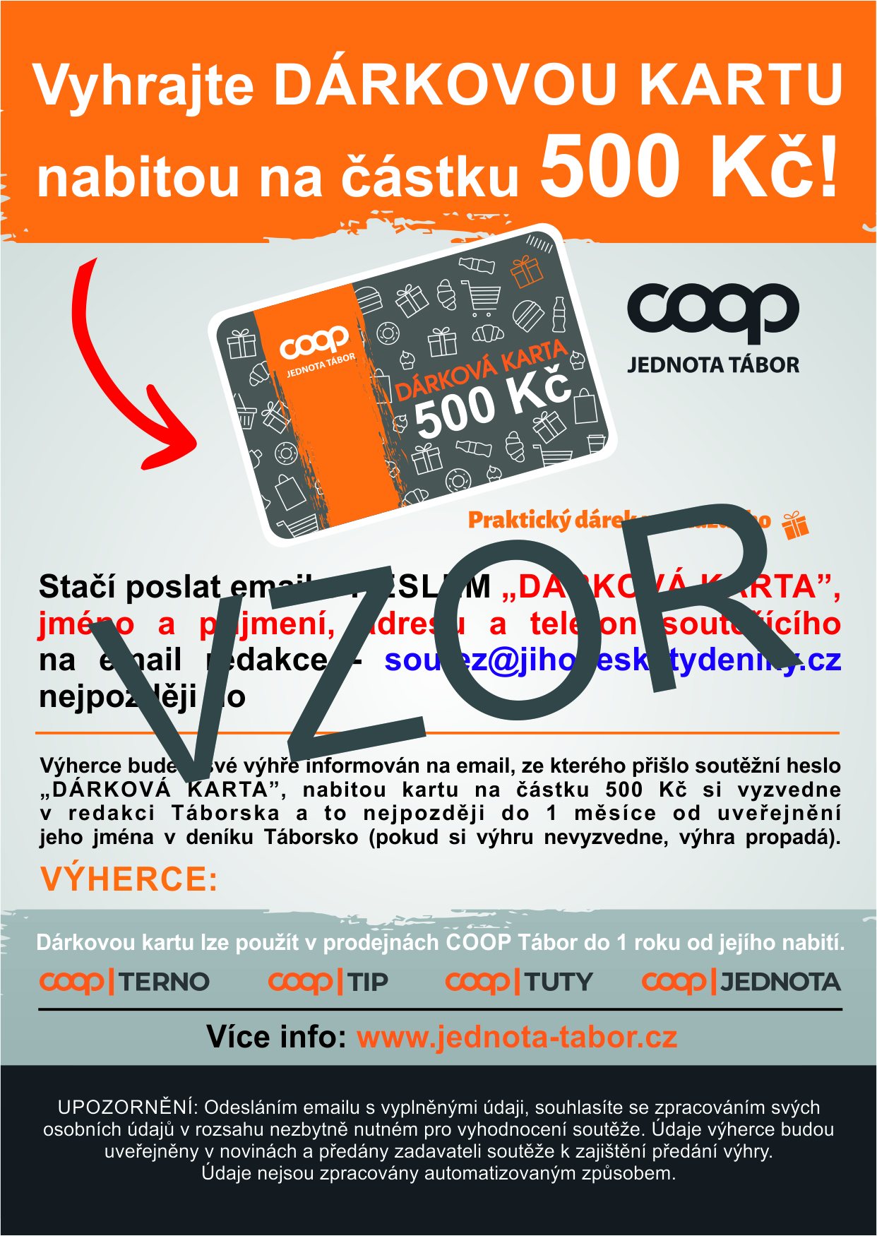 Vyhrajte každých 14 dní DÁRKOVOU KARTU COOP Jednoty Tábor nabitou na částku 500 Kč s Týdeníkem Táborsko, kde si KARTU bude moci výherce také osobně vyzvednout.